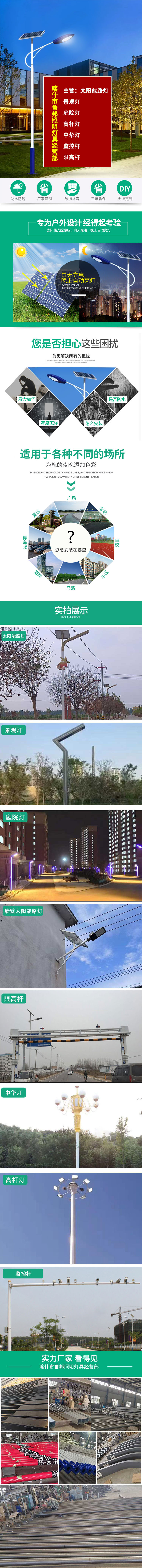 太阳能路灯是采用晶体硅太阳能电池供电,免维护阀控式密封蓄电池(胶体电池)储存电能,超高亮LED灯具作为光源,并由智能化充放电控制器控制,用于代替传统公用电力照明的路灯。无需铺设线缆、无需交流供电、不产生电费;采用直流供电、光敏控制;具有稳定性好、寿命长、发光效率高,安装维护简便、安全性能高、节能环保、经济实用等优点。可广泛应用于城市主、次干道、小区、工厂、旅游景点、停车场等场所。